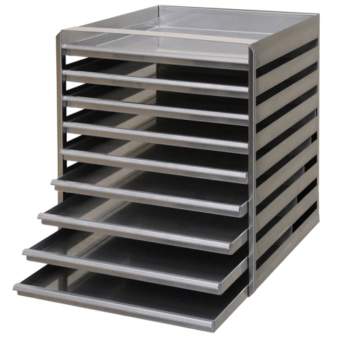 Stainless steel slide-in shelf with nine drawers for standard cryoboxes.