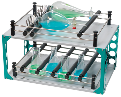 - Flexibles Aufsatzsystem. Mit den Spannleisten können stehende Gefäße jeglicher Form fixiert werden (Bechergläser, Erlenmeyerkolben, Reagenzglasgestelle etc.). Flache Schalen können direkt auf die Gummimatte gestellt werden (ohne Spannleisten).