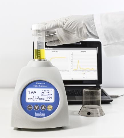 RTS-1 logs germ growth in 50 ml tubes in real time. Thanks to the innovative mixing technology, it is possible to measure the optical density of the sample non-invasively in real time.