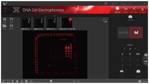 The VisionWorks software on the UVP GelSolo is a powerful yet intuitive software for capturing gel images and analyzing them. The simple user interface enables easy access to auto and manual image capture modes under the Device tab. Exposure time can be adjusted with customizable exposure settings. Captured images are saved in TIFF or JPEG formats.