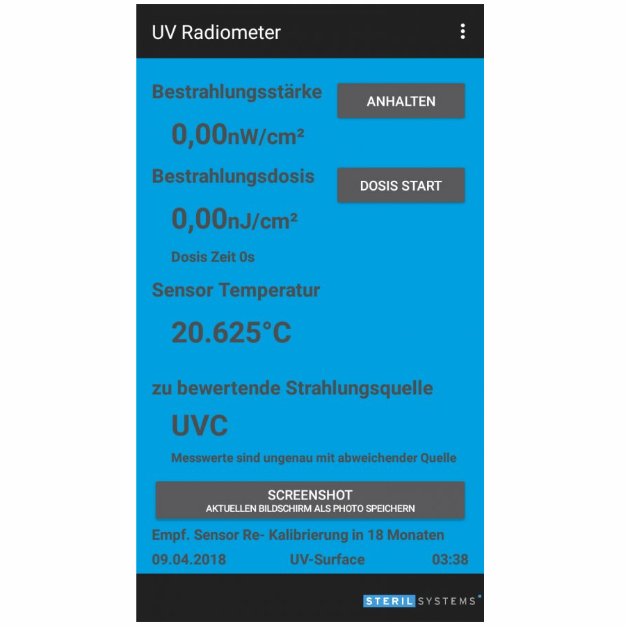 - spezial-Software mit übersichtlicher Angabe von Bestrahlungsstärke und Bestrahlungsdosis