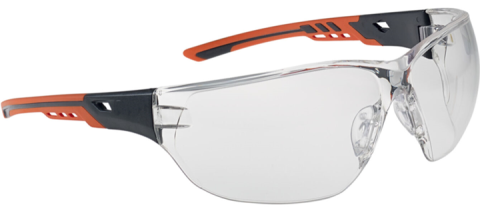 Clear safety glasses with very large lens for unrestricted vision when working.